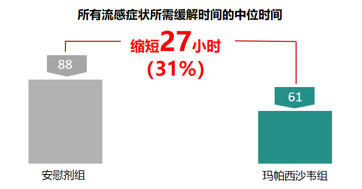瑪帕西沙韋對比安(an)慰劑縮短61.0h(53.0h vs 114.0h),有(yǒu)統計(ji)學(xué)差(cha)異(p<0.01)